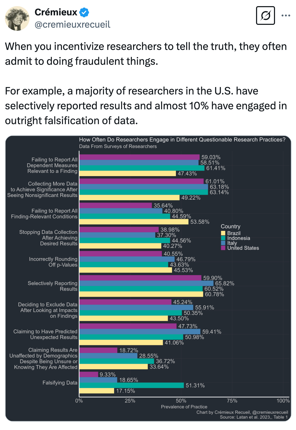 Non-specialists often conflate unintentional methodological errors with outright fraud, which can obscure the critical need for improved training and oversight. Scientists, by and large, do not know that questionable research practices are questionable. Let us look at a list that Cremieux recently put out. It is important to distinguish between deliberate misconduct and inadvertent errors; conflating the two can divert attention from the vital goal of enhancing overall research rigor. We must address intentional misconduct decisively (and yes, I think they should be fired and barred for life) while also investing in better training and resources to help researchers avoid unintentional errors.
